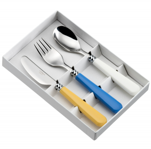 Coffret couverts enfant Helios de la marque Capdeco. 3 pièces: un couteau jaune pâle, une fourchette bleue ciel et une cuillère écume. Taille des couverts: longueur: 15 cm, épaisseur du haut des couverts: 2,5 mm. Couverts en acier inoxydable 18/10 et nylon, fabriqués en France.