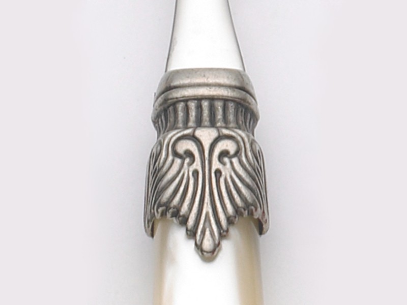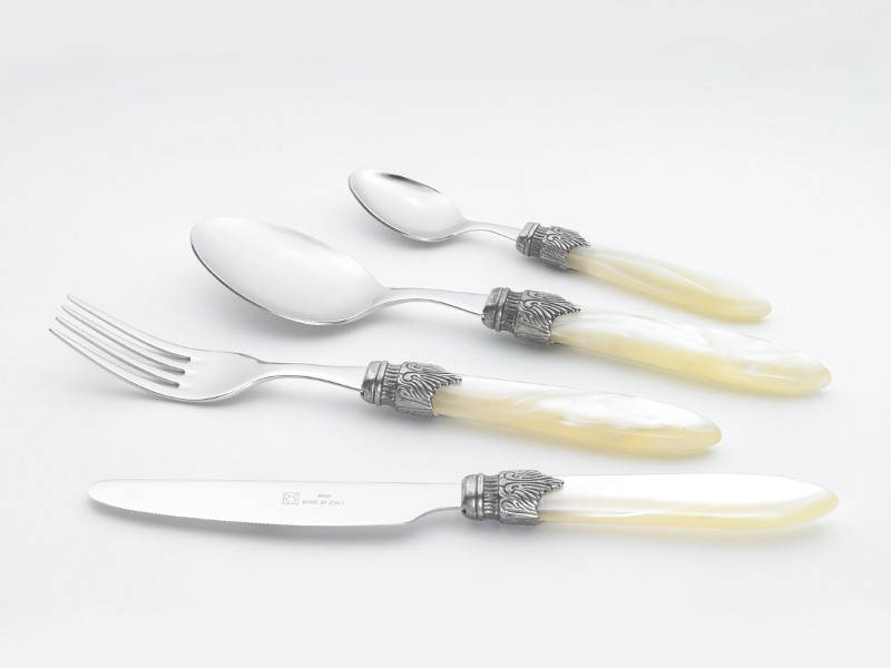La virole d'un goût ancien ainsi que le manche extrêmement lumineux donne à ces couverts un design classique et unique. Ces couverts de la marque italienne "Rivadossi Sandro" sont en inox et en méthacrylate. La virole est en métal chromé, la partie métallique en acier inoxydable 18/10 poli miroir et le manche en méthacrylate. Taille des couverts: Fourchette de table 22.30 cm, Cuillère de table 22.30 cm, Couteau de table 23.60 cm et Cuillère à café 16 cm. Epaisseur de la partie en inox: 2,5 mm, lave vaisselle (60°). Ces couverts fabriqués en Italie existent en 9 couleurs (sur demande): Bordeaux, Vert, Bleu, Ivoire, Noir, Orange, Rose, Rouge et Tortue. Nous pouvons vous proposer aussi les couverts de service, vendus à l'unité, et toutes les autres pièces de la collsection, vendues par 6. Les manches des couverts Laura sont pointus contrairement aux manches de couverts du modèle "Vintage" qui sont arrondis.